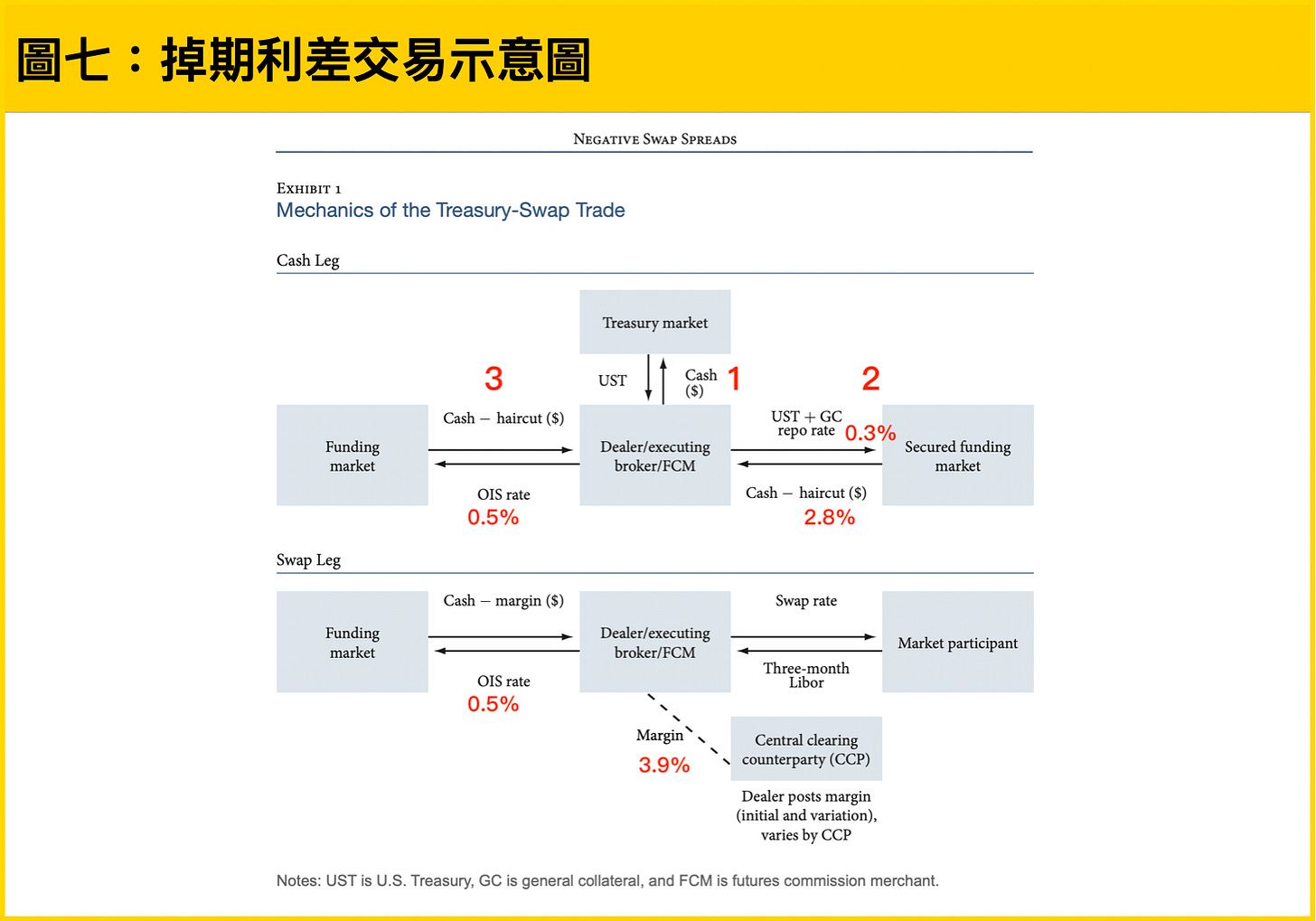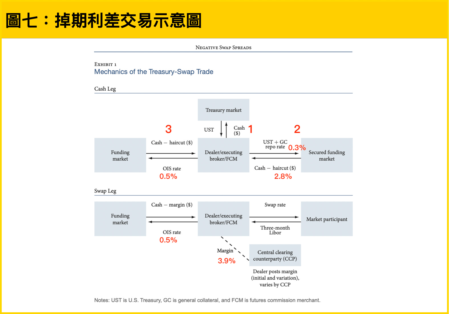 以下是《負掉期利差 Negative Swap Spreads》中以做市商為例的「掉期利差交易」。可以看到做市商如何「不花自己一毛錢」就建立套利交易!(圖七)
