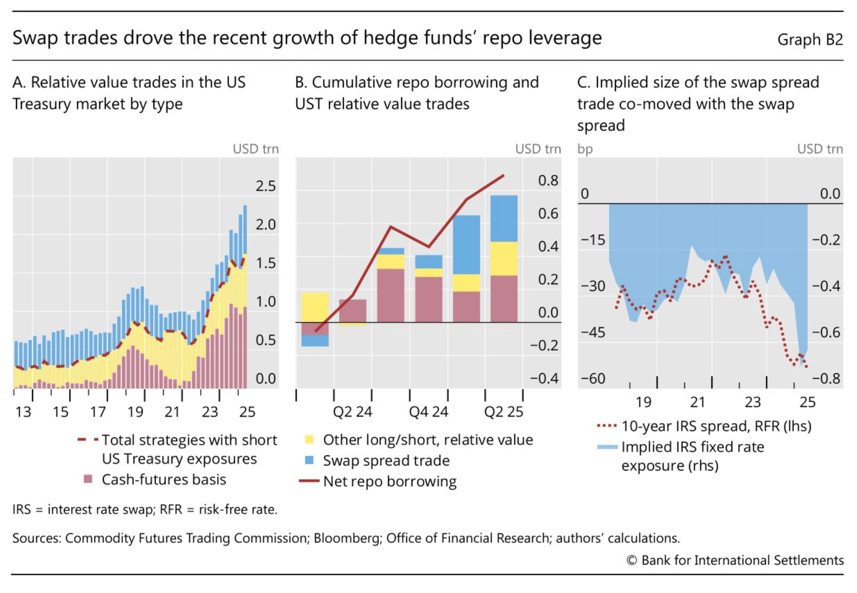 根據 BIS 在 2025 年底的文章顯示,即使經過 2025/4 的解槓桿浪潮,掉期利差交易的規模到 25Q2 仍然有超過 6000 億美元之多!(6310億美元)