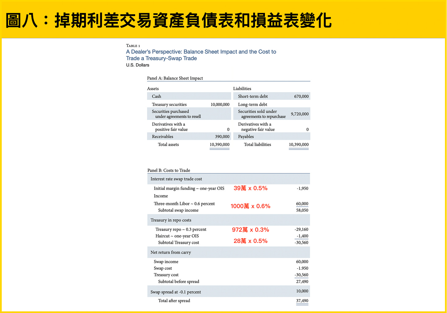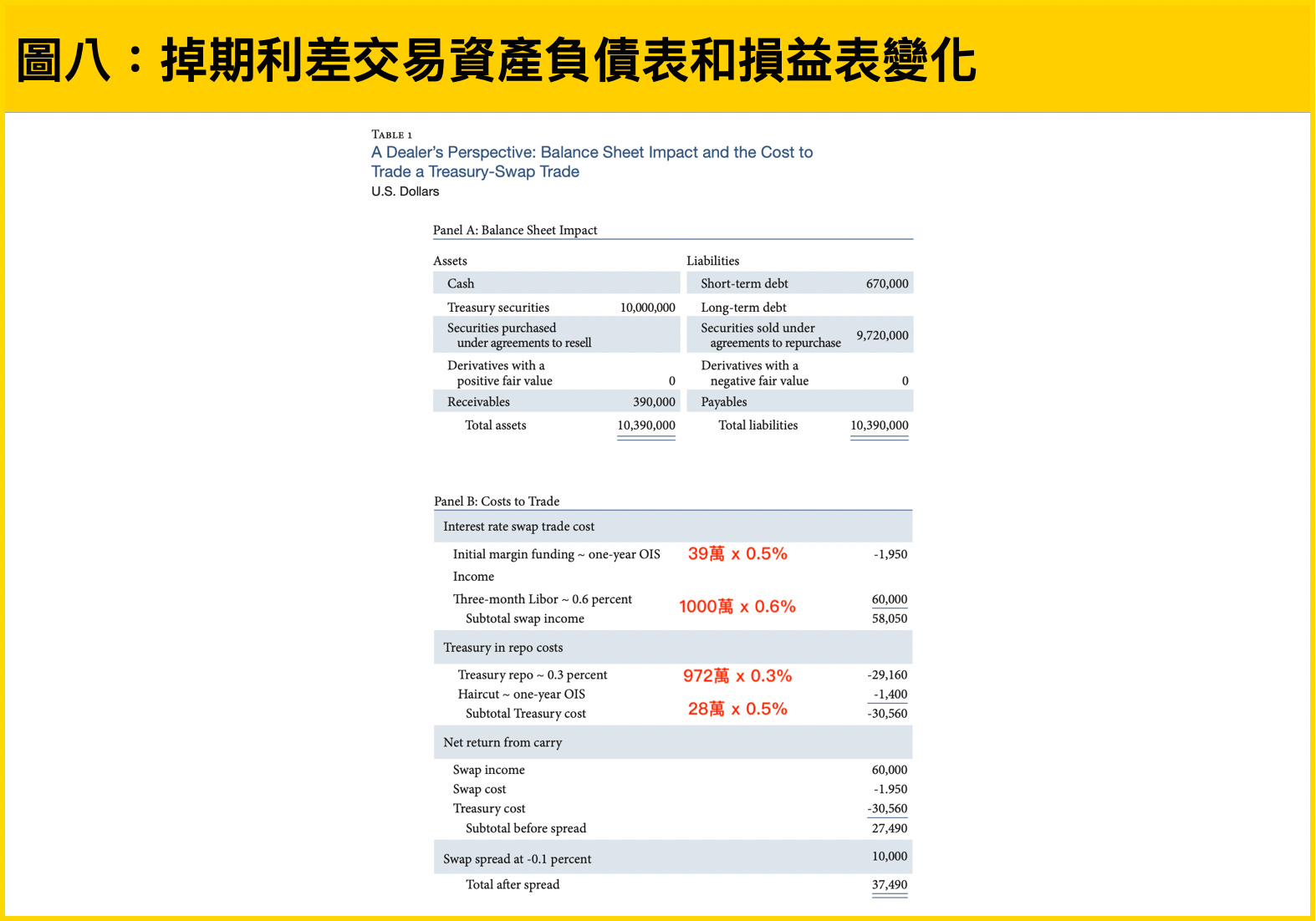 根據上述例子的數據來計算,並且假設掉期利差為 -0.1% 的情況下,從圖八可以看到完整的資產負債表和套利的損益計算。