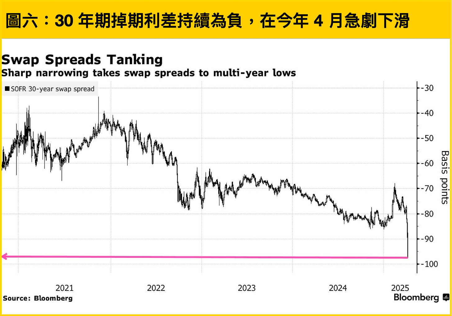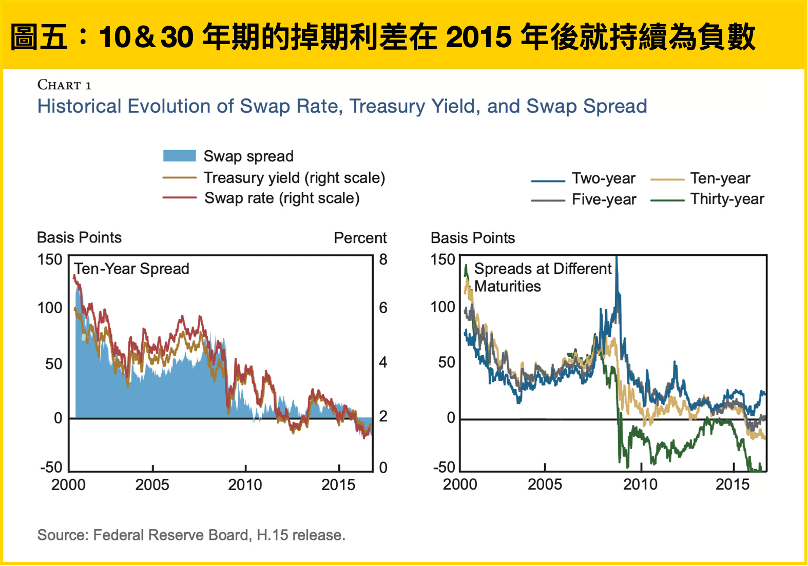 然而從圖五和圖六可以看到,10 年期和 30 年期的掉期利差在 2015 年後就持續為負數,到現階段仍是如此,明顯與正常邏輯不同。